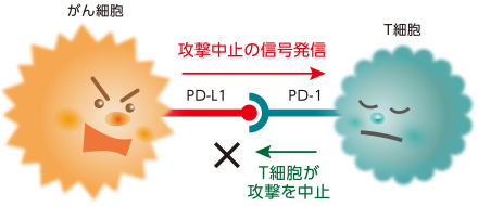 ブレーキをかける信号は、がん細胞表面にあるPD-L1(ピーディーエルワン)というたんぱく質がT細胞表面のPD-1(ピーディーワン)というたんぱく質と結合することにより発信されます。