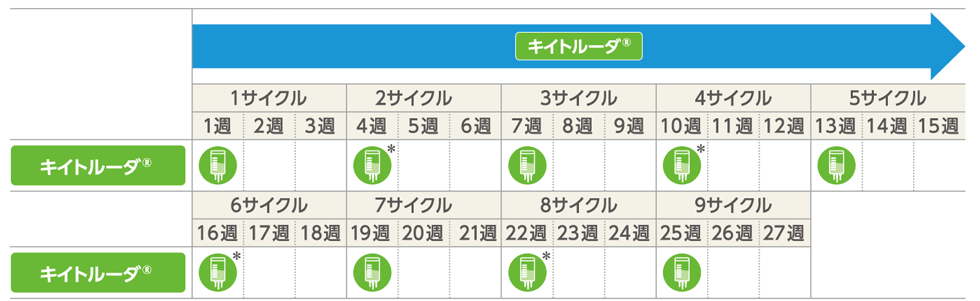 キイトルーダ®単剤で200mgを3週間に1回投与を9回、または400mgを6週間に1回投与を5回行います。