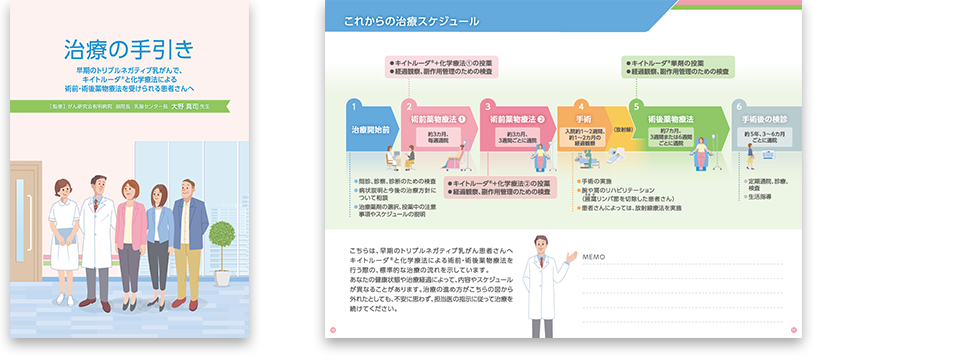 キイトルーダ®の治療を受ける早期のトリプルネガティブ乳がんの患者さん向けに、初期治療全体の流れをまとめた「治療の手引き」をご用意しています。