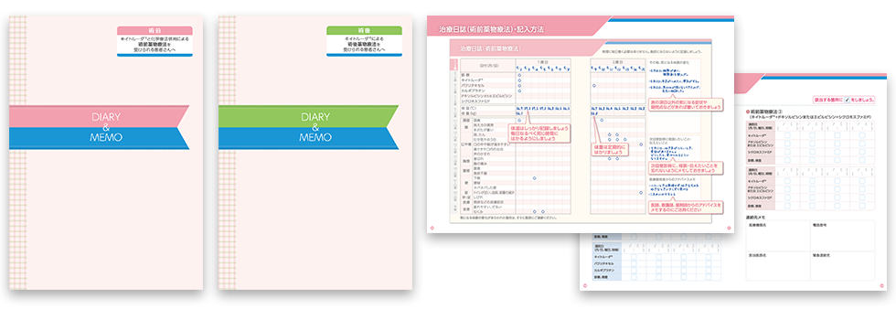 また、診察日や投薬日などの治療スケジュールや、患者さんがご自身で体調を把握し、治療チームに知らせるメモとしてお役立ていただくための「キイトルーダ®治療日誌(術前薬物療法/術後薬物療法)」をご用意しています。