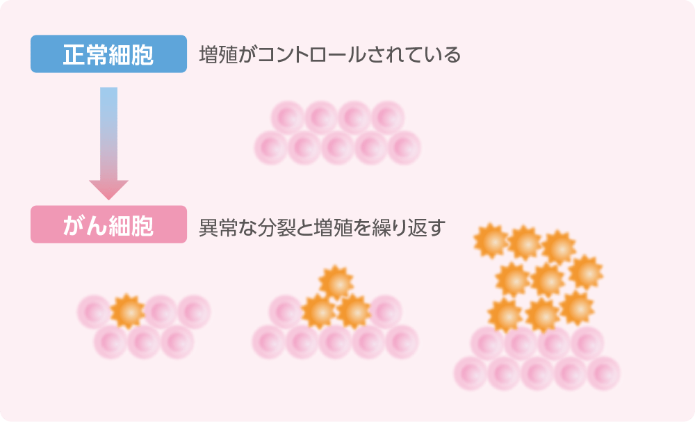 正常な細胞は、際限なく増殖することがないようにコントロールされていますが、なんらかの原因によりその遺伝子に変化(遺伝子変異)が起こると、細胞は異常な分裂と増殖を繰り返すようになります。