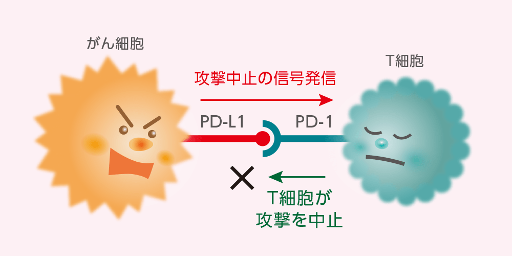 ブレーキをかける信号は、がん細胞表面にあるPD-L1(ピーディーエルワン)というたんぱく質がT細胞表面のPD-1(ピーディーワン)というたんぱく質と結合することにより発信されます。