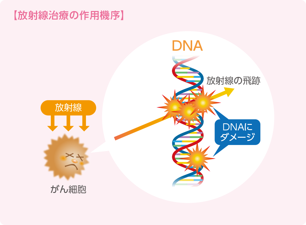 放射線治療とは、放射線の照射によって細胞のDNAにダメージを与えることで、がん細胞を死滅させる治療です。放射線治療は、がん細胞だけでなく正常細胞にも影響を及ぼします。
