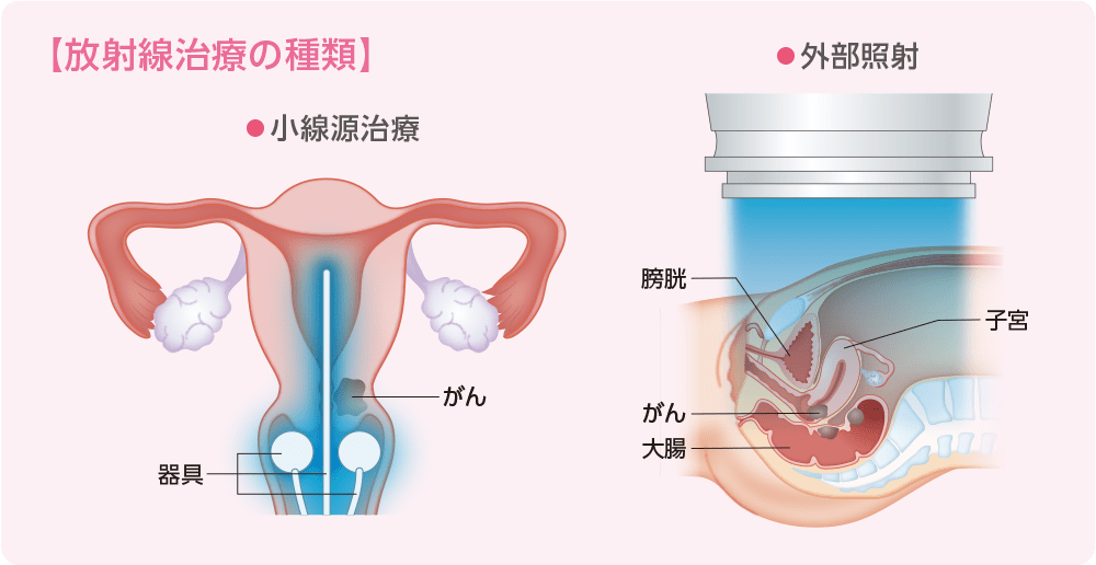 放射線治療の方法には、体外からの照射(外部照射)と体の内部からの照射(小線源治療)があります。子宮頸がんの放射線治療では、この2つの方法を併用することで、照射の効率を高めます。