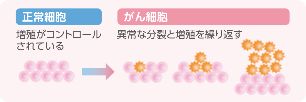 正常な細胞は、際限なく増殖することがないようにコントロールされていますが、なんらかの原因によりその遺伝子に変化(遺伝子変異)が起こると、細胞は異常な分裂と増殖を繰り返すようになります。