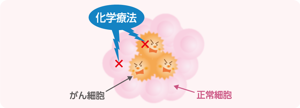 殺細胞性抗がん薬による治療を化学療法といいます。化学療法は、活発に分裂しているがん細胞の増殖を阻止したりすることで、がん細胞を死滅させる治療です。