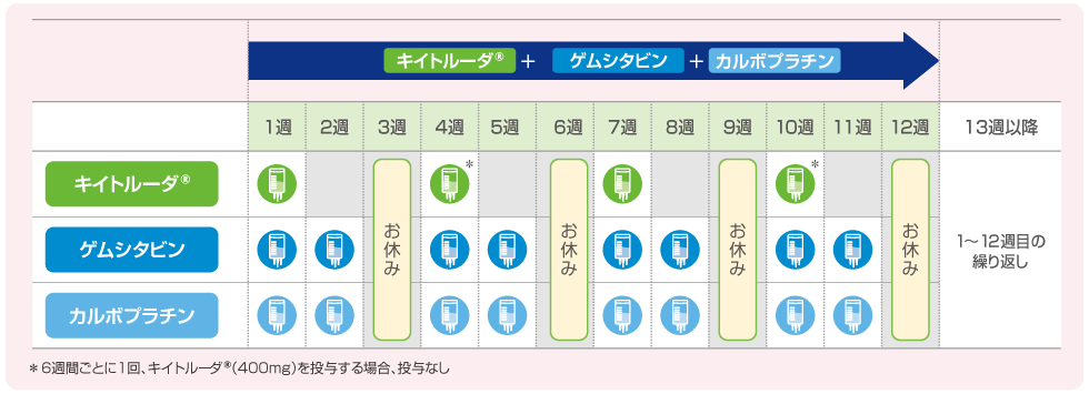 キイトルーダ®は200mgを3週に1回投与、または400mgを6週に1回投与、ゲムシタビンおよびカルボプラチンは1週目、2週目に投与、3週目は休薬します。
