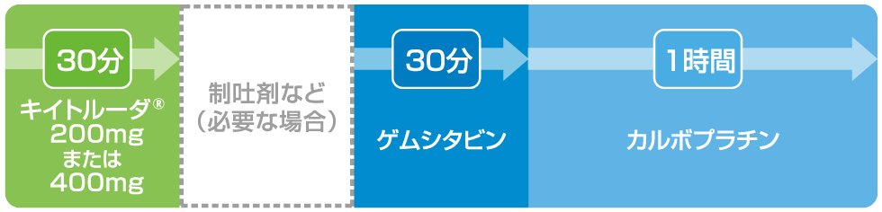 キイトルーダ®200mgまたは400mgを約30分かけて静脈内へ点滴します。その後、ゲムシタビンとカルボプラチンを投与します。