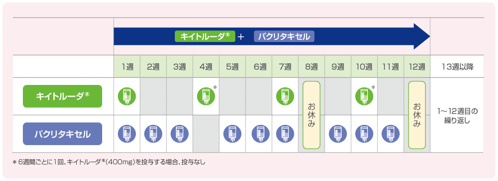 キイトルーダ®は200mgを3週に1回投与、または400mgを6週に1回投与、パクリタキセルは1週目、2週目、3週目に投与、4週目は休薬します。