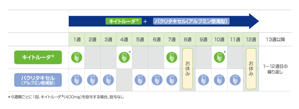 キイトルーダ®は200mgを3週に1回投与、または400mgを6週に1回投与、パクリタキセル(アルブミン懸濁型)は1週目、2週目、3週目に投与、4週目は休薬します。