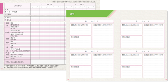 診察日や投与などの治療スケジュールや、患者さんがご自身で体調を把握し、治療チームに知らせるメモとしてお役立ていただくための「キイトルーダ®と化学療法の併用療法の治療日誌」をご用意しています。