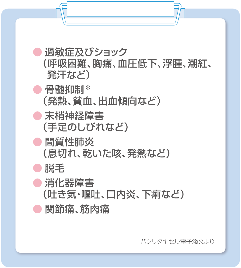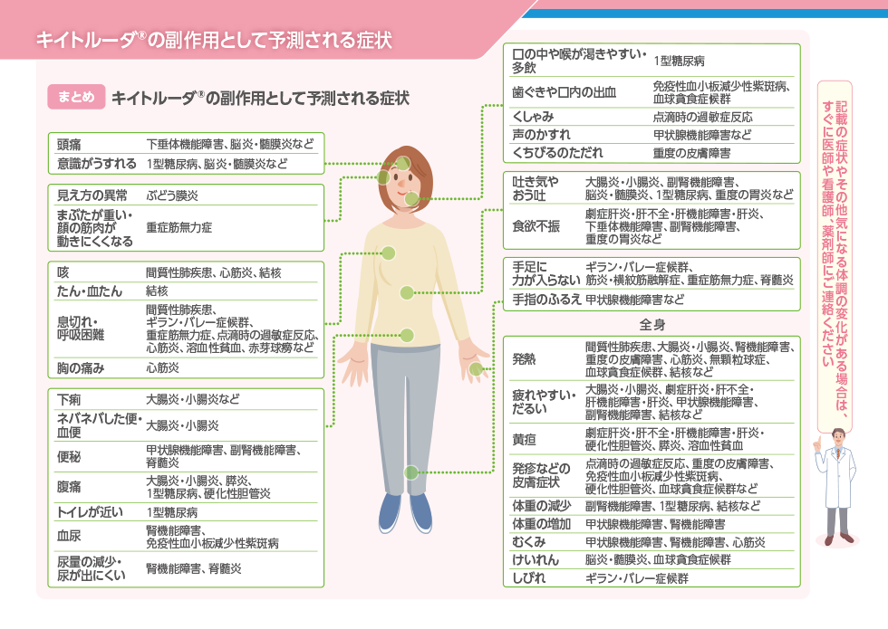 症状のあらわれ方には個人差があり、発見が遅れると重症化することや継続的な治療が必要となる場合があります。あらかじめ副作用の種類や症状を知っておくことは、副作用の早期発見と対処につながります。