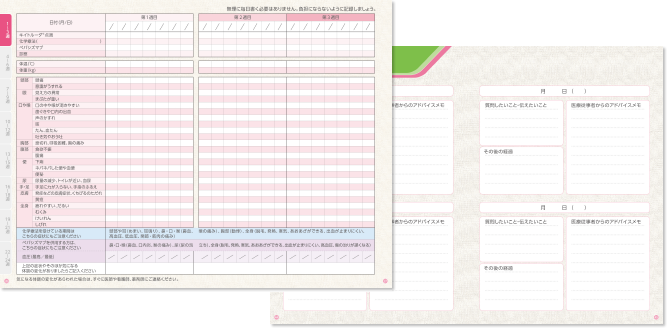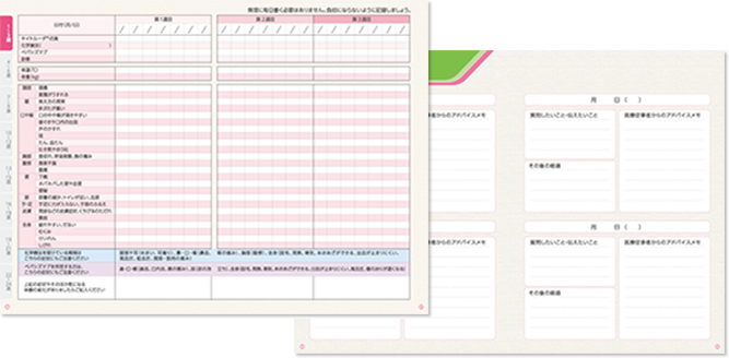 診察日や投与などの治療スケジュールや、患者さんがご自身で体調を把握し、治療チームに知らせるメモとしてお役立ていただくための「キイトルーダ®と化学療法±ベバシズマブの併用治療日誌」をご用意しています。