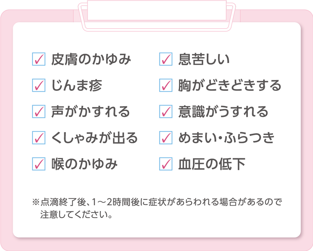 点滴中や点滴直後にアレルギーのような症状があらわれる「点滴時の過敏症反応(infusion reaction:インフュージョン リアクション)」が起こることがあります。点滴中あるいは点滴後に下記のような症状があらわれた場合には、担当の医師または看護師、薬剤師に連絡してください。
