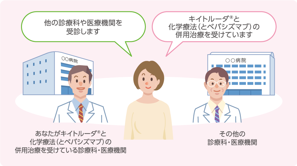 治療を始めてから、他の医療機関を受診する場合には、あなたがキイトルーダ®と化学療法±ベバシズマブ併用治療を受けている主治医に相談しましょう。なお、相談し忘れてしまった場合でも、きちんと報告することが大切です。また、他の医療機関を受診したら、受診先の医療スタッフにも併用治療を受けていることを知らせてください。