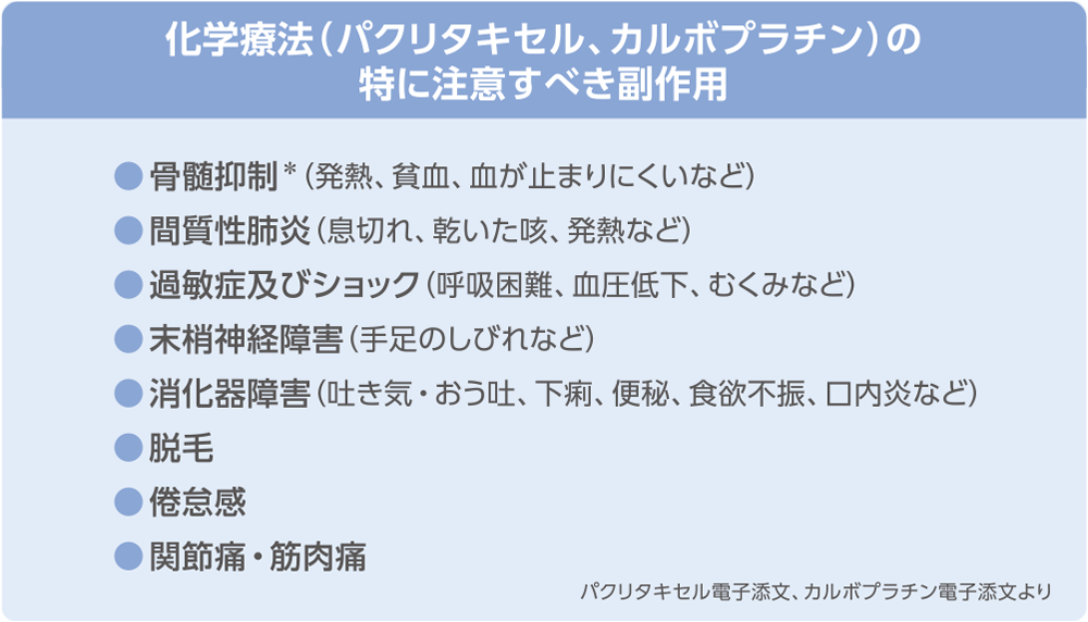 化学療法(パクリタキセル、カルボプラチン)を併用することにより、以下の副作用とそれに伴う症状があらわれる可能性があります。