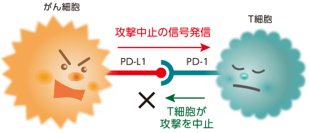 ブレーキをかける信号は、がん細胞表面にあるPD-L1(ピーディーエルワン)というたんぱく質がT細胞表面のPD-1(ピーディーワン)というたんぱく質と結合することにより発信されます。