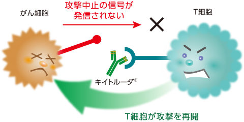 キイトルーダ®は「抗PD-1(ピーディーワン)抗体」とよばれる免疫チェックポイント阻害薬で、T細胞のPD-1(ピーディーワン)に結合することにより、がん細胞からT細胞に送られているブレーキをかける信号を遮断します。その結果、T細胞が活性化され、抗がん作用が発揮されると考えられています。