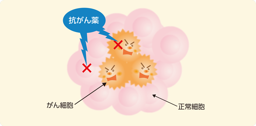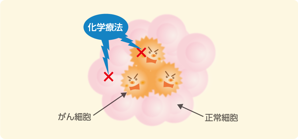 殺細胞性抗がん薬による治療を化学療法といいます。化学療法は、活発に分裂しているがん細胞の増殖を阻止したりすることで、がん細胞を死滅させる治療です。がん細胞も正常細胞も攻撃します。