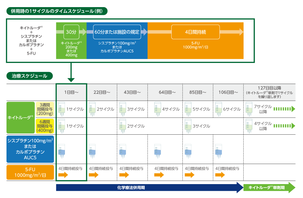 キイトルーダ®は30分間かけて点滴します。その後でシスプラチンまたはカルボプラチン、および5-FUを点滴します。5-FUは4日間連続で点滴します。