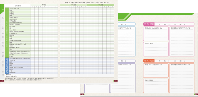 診察日や投与などの治療スケジュールや、患者さんがご自身で体調を把握し、治療チームに知らせるメモとしてお役立ていただくための「キイトルーダ®と化学療法の併用療法の治療日誌」をご用意しています。