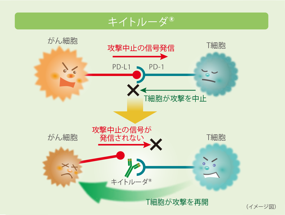 キイトルーダ®(免疫チェックポイント阻害薬)はT細胞のPD-1に結合することにより、がん細胞からT細胞に送られているブレーキをかける信号を遮断します。その結果、T細胞が活性化され、抗がん作用が発揮されると考えられています。