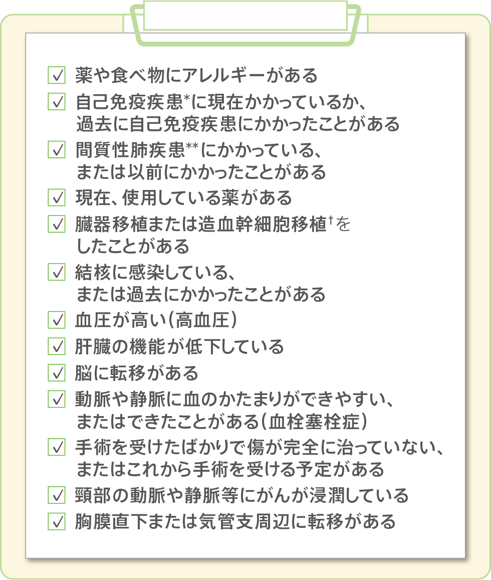 治療を始める前に、以下の項目に該当する方は、必ず担当の医師や看護師、薬剤師にお伝えください。