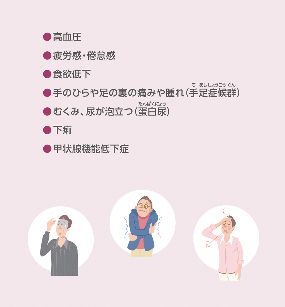 症状のあらわれ方には個人差があり、発見が遅れると重症化することや継続的な治療が必要となる場合があります。あらかじめ副作用の種類や症状を知っておくことは、副作用の早期発見と対処につながります。