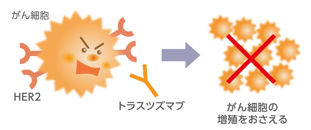 トラスツズマブはがん細胞の増殖に関わるHER2タンパクを標的とした分子標的薬であり、HER2タンパクの働きを妨げることで、がん細胞の増殖を抑える薬です。