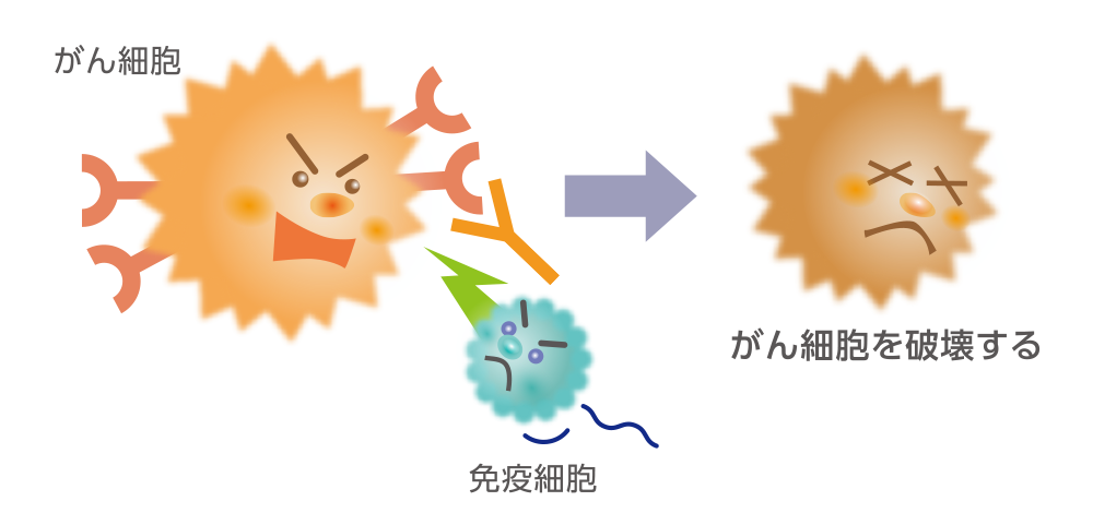 さらに、トラスツズマブがHER2タンパクに結合すると、それを攻撃の目印として免疫細胞が引き寄せられ、がん細胞を破壊していくと考えられています。