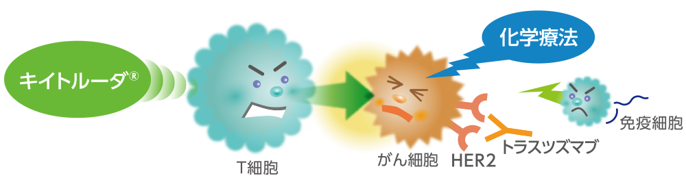 キイトルーダ®はがん細胞を攻撃するT細胞の機能を活性化し、トラスツズマブはがん細胞の増殖を抑え、免疫細胞をがん細胞に引き寄せることでがん細胞を破壊します。また、化学療法はがん細胞を直接攻撃します。これらを併用して治療すると、異なる作用でがん細胞を攻撃するため、それぞれの治療効果が期待できます。
