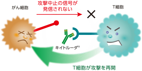 キイトルーダ®は「抗PD-1(ピーディーワン)抗体」とよばれる免疫チェックポイント阻害薬で、T細胞のPD-1(ピーディーワン)というたんぱく質と結合することにより、がん細胞からT細胞に送られているブレーキをかける信号を遮断します。その結果、T細胞が活性化され、抗がん作用が発揮されると考えられています。