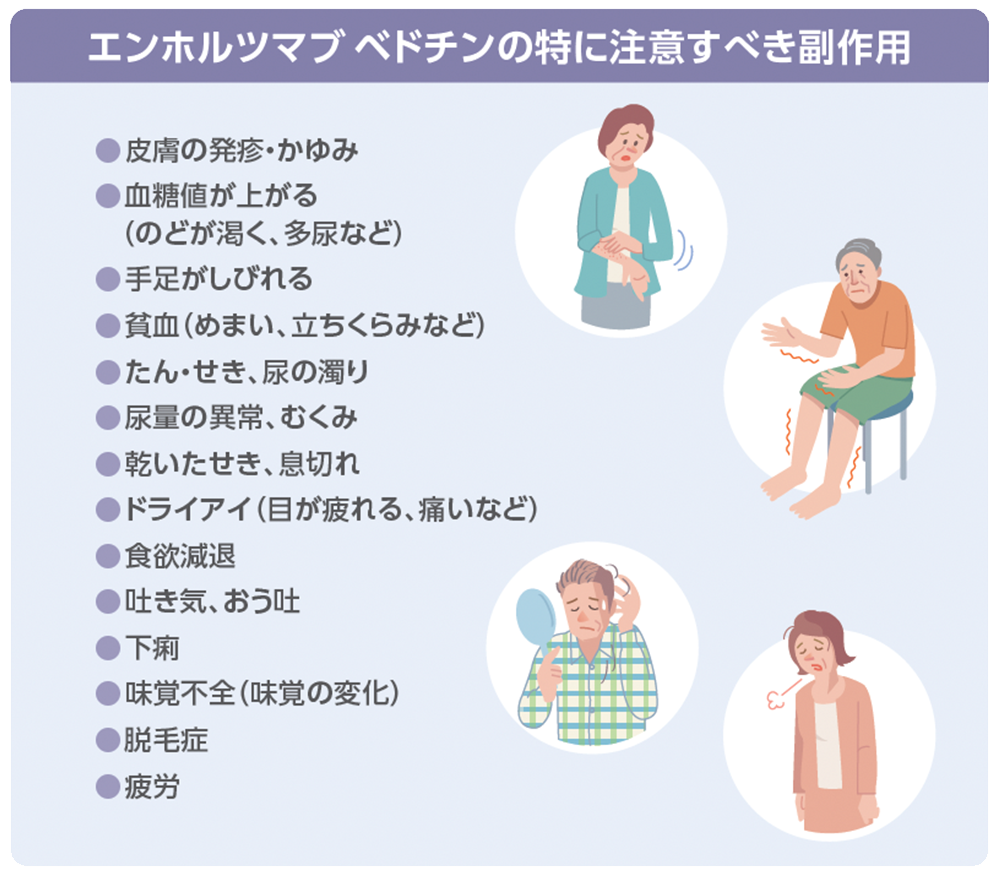 エンホルツマブ ベドチンの副作用については、エンホルツマブ ベドチンの患者さん向けパンフレットをご参照ください。