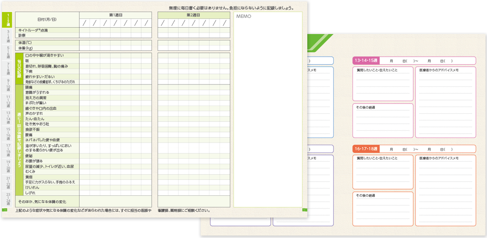 診察日や投与などの治療スケジュールや、患者さんがご自身で体調を把握し、治療チームに知らせるメモとしてお役立ていただくための「 キイトルーダ®治療日誌 」をご用意しています。