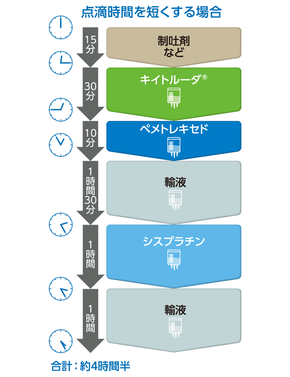 キイトルーダ®と併用する化学療法によって点滴のタイムスケジュールと治療スケジュールは異なります。ご自身の点滴のタイムスケジュールと治療スケジュールを確認しておきましょう。