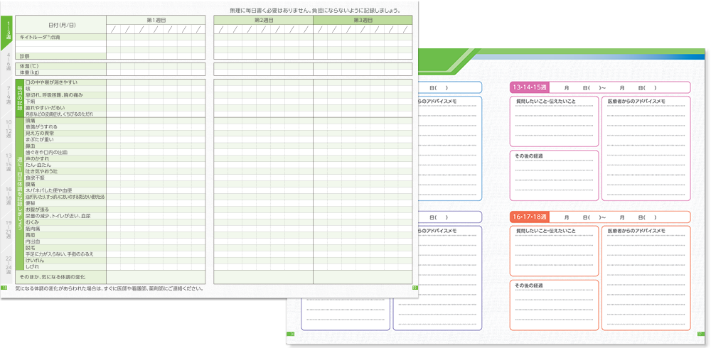 治療を順調に進めていくためには、患者さんと担当の医師や看護師、薬剤師をはじめとする治療チームとが信頼し合うことが大切です。そのためには、治療中の体調をチームに理解してもらうことが第一歩となります。以下から、ダウンロードできますので、より良い治療のために、ぜひ、お役立てください。